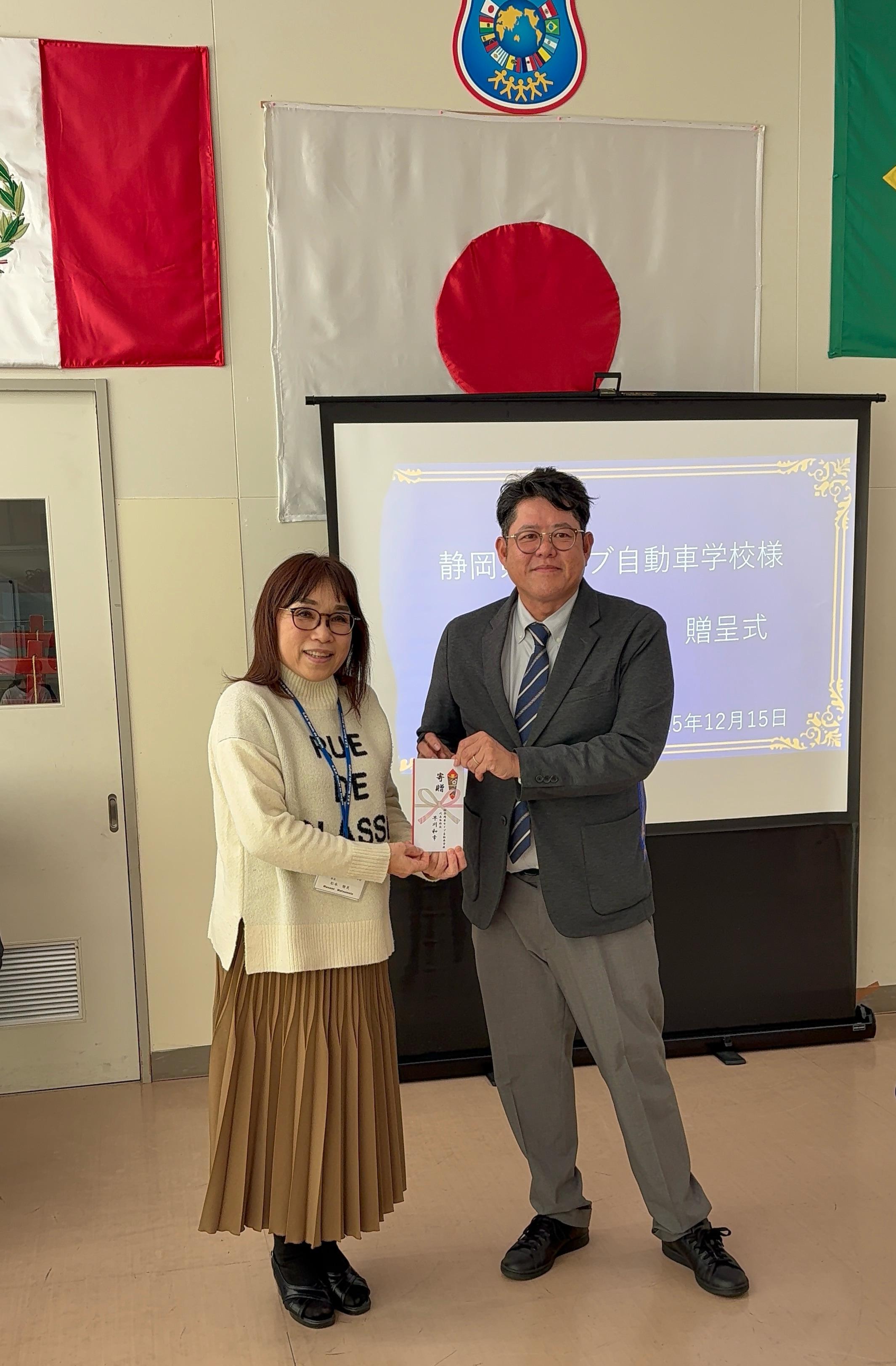 静岡県セイブ自動車学校 早川智文様より松本校長へ寄付金贈呈